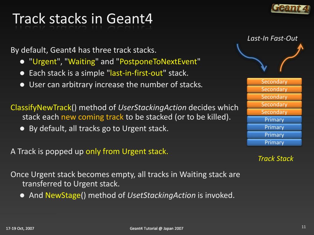Track stacks in Geant4 Last-In Fast-Out • By default, Geant4 has three track stacks. • "Urgent", "Waiting" and "PostponeToNextEvent" • Each stack is a simple "last-in-first-out" stack. • User can arbitrary increase the number of stacks. • ClassifyNewTrack() method of UserStackingAction decides which stack each new coming track to be stacked (or to be killed). • By default, all tracks go to Urgent stack. • A Track is popped up only from Urgent stack. • Once Urgent stack becomes empty, all tracks in Waiting stack are transferred to Urgent stack. • And NewStage() method of UsetStackingAction is invoked. Secondary Secondary Secondary Secondary Secondary Primary Primary Primary Primary Track Stack
