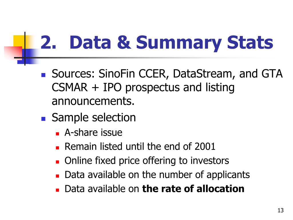 2. Data & Summary Stats • Sources: SinoFin CCER, DataStream, and GTA CSMAR + IPO prospectus and listing announcements. • Sample selection • A-share issue • Remain listed until the end of 2001 • Online fixed price offering to investors • Data available on the number of applicants • Data available on the rate of allocation