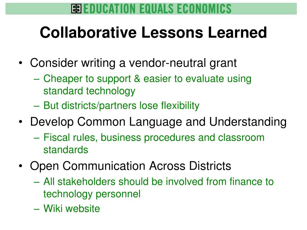 Collaborative Lessons Learned • Consider writing a vendor-neutral grant • Cheaper to support & easier to evaluate using standard technology • But districts/partners lose flexibility • Develop Common Language and Understanding • Fiscal rules, business procedures and classroom standards • Open Communication Across Districts • All stakeholders should be involved from finance to technology personnel • Wiki website