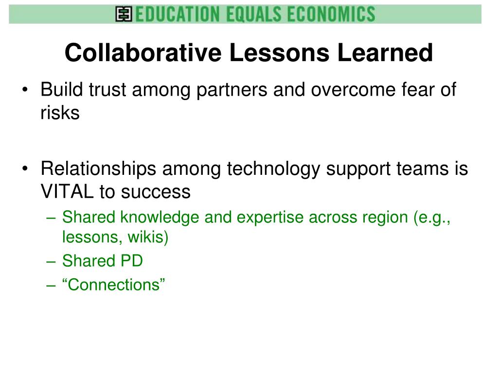 Collaborative Lessons Learned • Build trust among partners and overcome fear of risks • Relationships among technology support teams is VITAL to success • Shared knowledge and expertise across region (e.g., lessons, wikis) • Shared PD • “Connections”