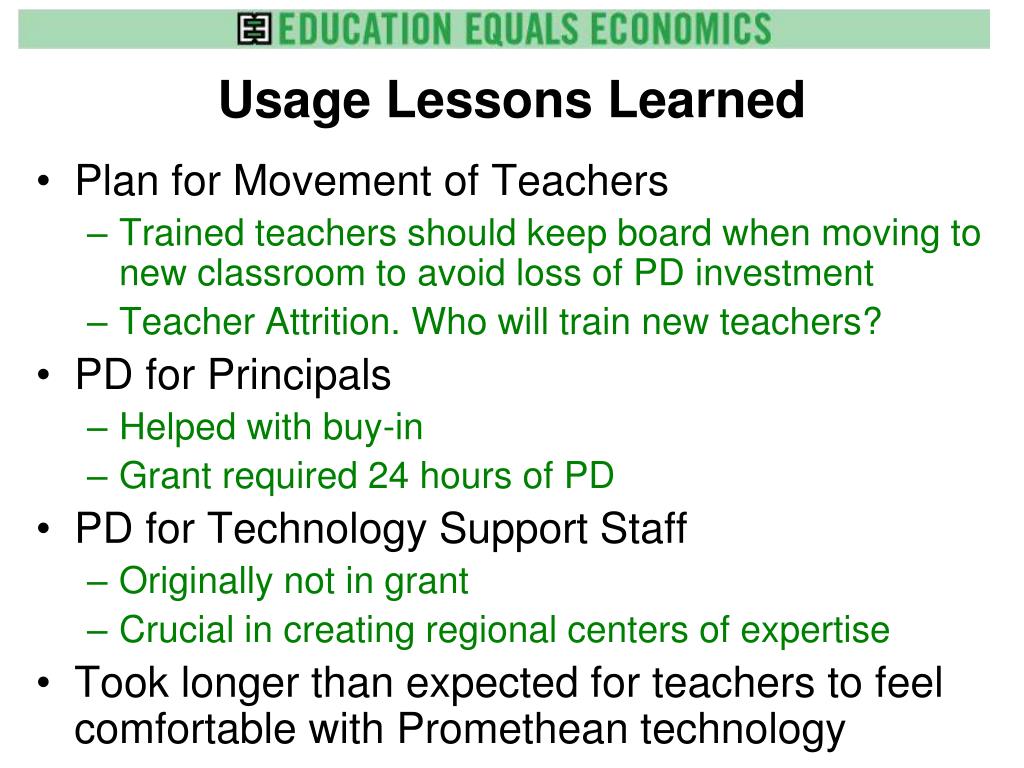 Usage Lessons Learned • Plan for Movement of Teachers • Trained teachers should keep board when moving to new classroom to avoid loss of PD investment • Teacher Attrition. Who will train new teachers? • PD for Principals • Helped with buy-in • Grant required 24 hours of PD • PD for Technology Support Staff • Originally not in grant • Crucial in creating regional centers of expertise • Took longer than expected for teachers to feel comfortable with Promethean technology