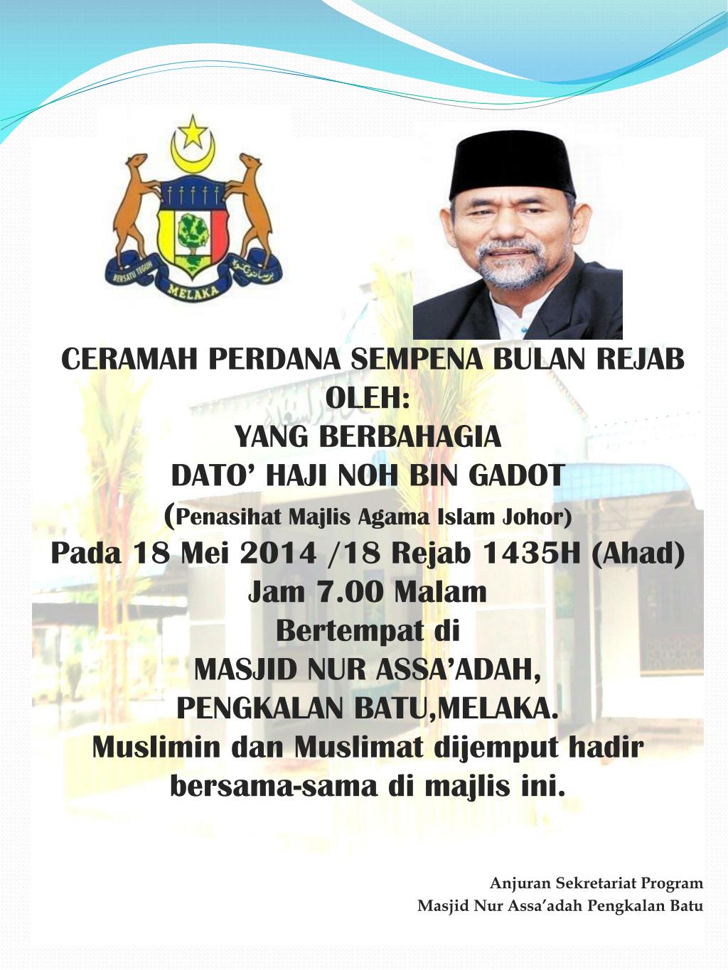 CERAMAH PERDANA SEMPENA BULAN REJABOLEH:YANG BERBAHAGIA DATO’ HAJI NOH BIN GADOT(PenasihatMajlis Agama Islam Johor)Pada 18 Mei 2014 /18 Rejab 1435H (Ahad)Jam 7.00 MalamBertempatdiMASJID NUR ASSA’ADAH,PENGKALAN BATU,MELAKA.Muslimin dan Muslimat dijemput hadirbersama-samadimajlisini. AnjuranSekretariat Program MasjidNurAssa’adahPengkalanBatu