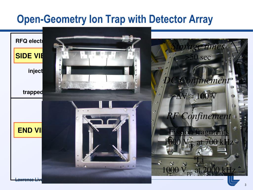 RFQ electrodes SIDE VIEW: inject ions trapped ions HPGe detector HPGe detector HPGe detector HPGe detector Si telescope END VIEW: Open-Geometry Ion Trap with Detector Array Storage times >50 sec DC Confinement DV ≈ 100 V RF Confinement Fission fragments 1000 Vpp at 700 kHz 8Li 1000 Vpp at 2000 kHz