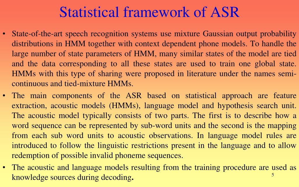 Statistical Approach to ASR Back End Acoustic Modeling Front End Recognized speech microphone parameters Pre-Processing Feature- Extraction Recognizer Speech sound LPCC/ MFCC Language Modeling 4