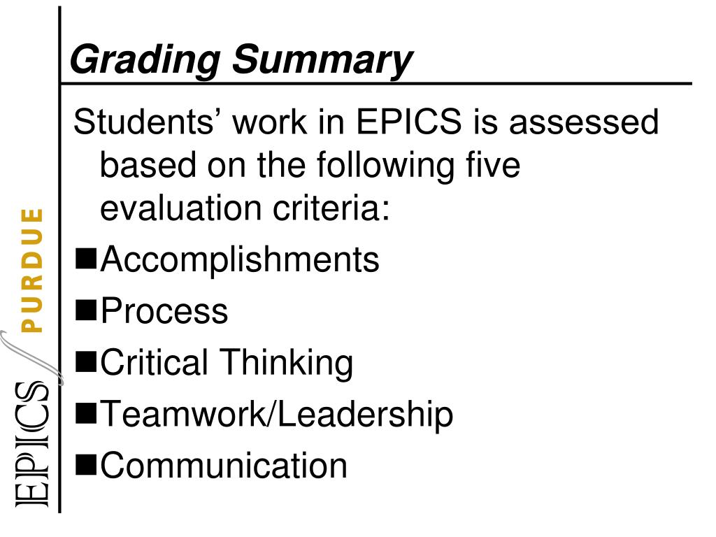 Grading Summary Students’ work in EPICS is assessed based on the following five evaluation criteria: • Accomplishments • Process • Critical Thinking • Teamwork/Leadership • Communication