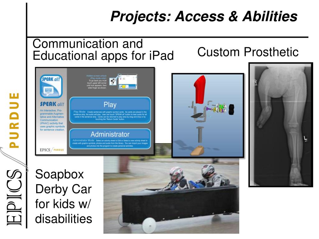 Projects: Access & Abilities Communication and Educational apps for iPad Custom Prosthetic Soapbox Derby Car for kids w/ disabilities