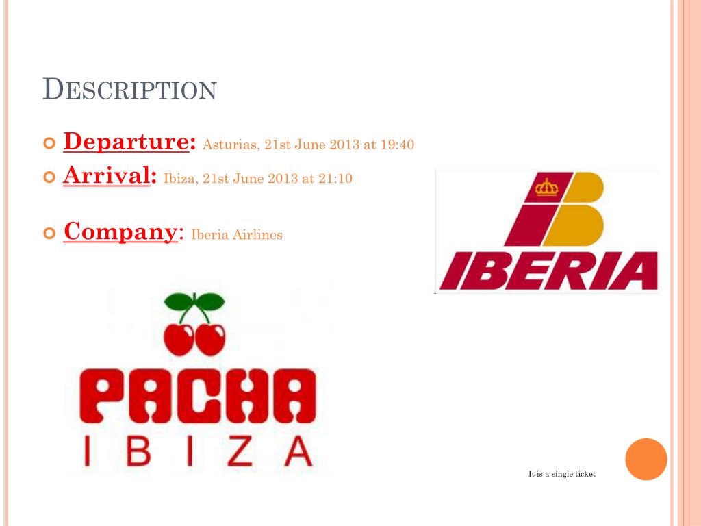 Description • Departure:Asturias, 21st June 2013 at 19:40 • Arrival:Ibiza, 21st June 2013 at 21:10 • Company:Iberia Airlines Itis a single ticket