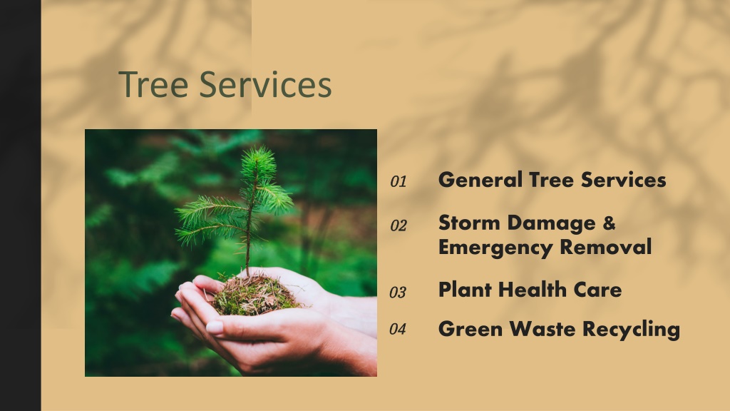 Tree Services General Tree Services 01 • Storm Damage & Emergency Removal 02 • Plant Health Care 03 Green Waste Recycling 04