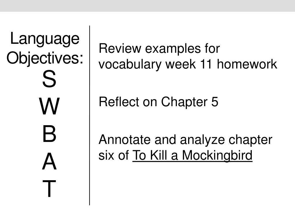 Language Objectives: Review examples for vocabulary week 11 homework Reflect on Chapter 5 Annotate and analyze chapter six of To Kill a Mockingbird S W B A T