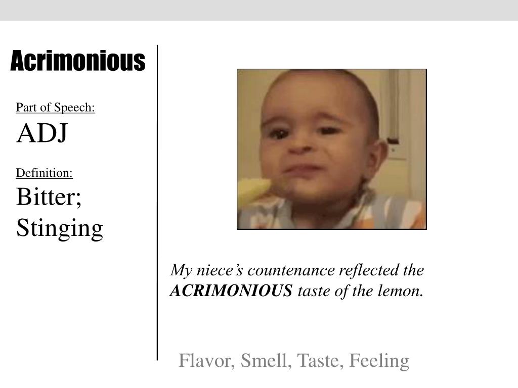 Acrimonious Part of Speech: ADJ Definition: Bitter; Stinging My niece’s countenance reflected the ACRIMONIOUS taste of the lemon. Flavor, Smell, Taste, Feeling