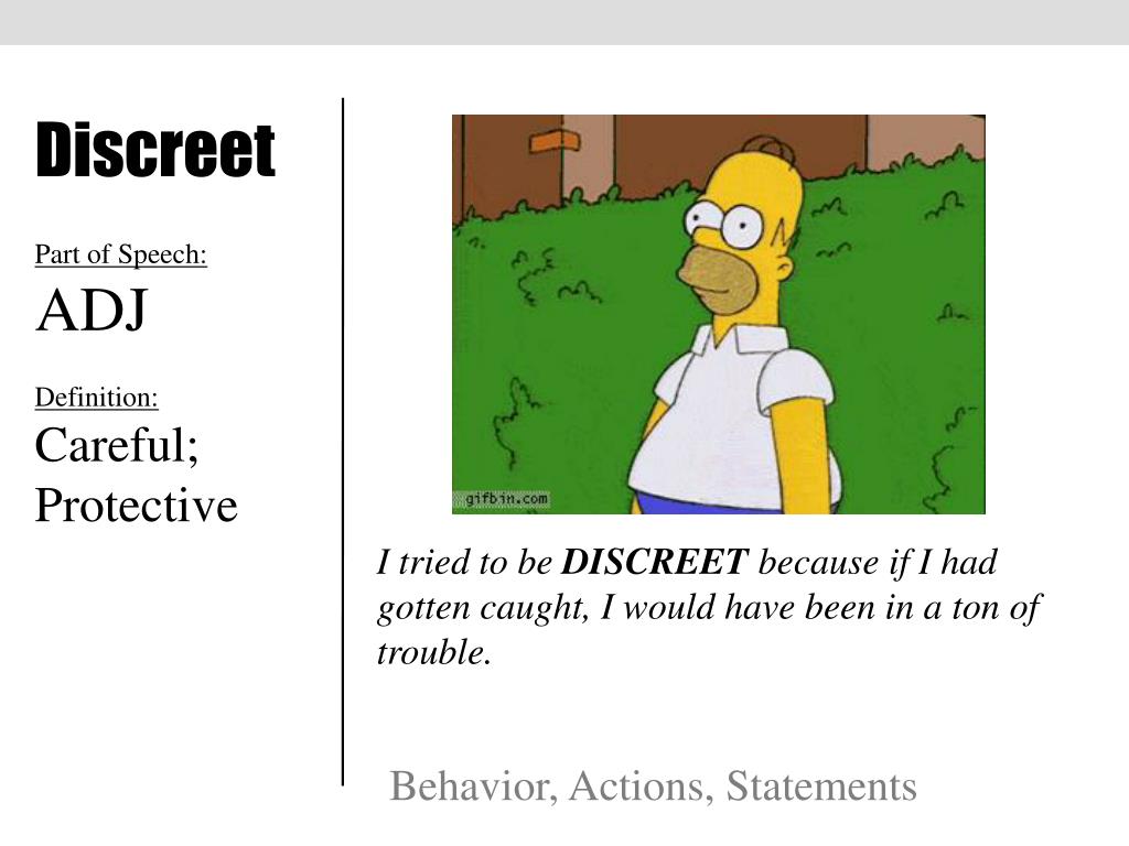 Discreet Part of Speech: ADJ Definition: Careful; Protective I tried to be DISCREET because if I had gotten caught, I would have been in a ton of trouble. Behavior, Actions, Statements