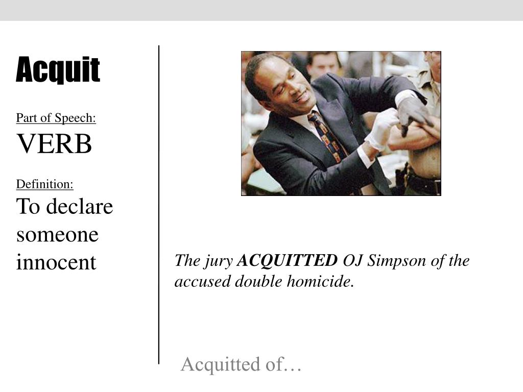 Acquit Part of Speech: VERB Definition: To declare someone innocent The jury ACQUITTED OJ Simpson of the accused double homicide. Acquitted of…