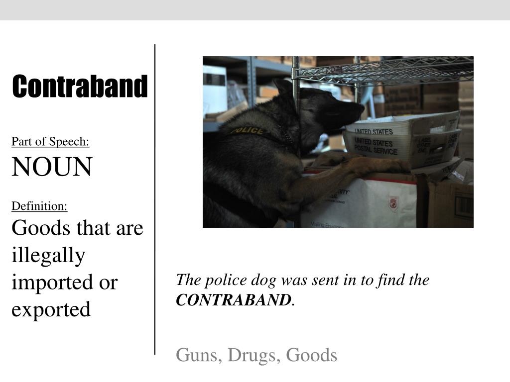 Contraband Part of Speech: NOUN Definition: Goods that are illegally imported or exported The police dog was sent in to find the CONTRABAND. Guns, Drugs, Goods
