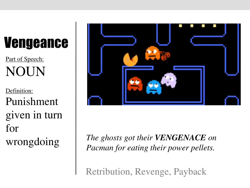 Vengeance Part of Speech: NOUN Definition: Punishment given in turn for wrongdoing The ghosts got their VENGENACE on Pacman for eating their power pellets. Retribution, Revenge, Payback
