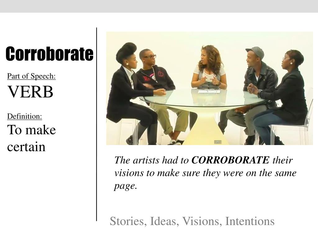 Corroborate Part of Speech: VERB Definition: To make certain The artists had to CORROBORATE their visions to make sure they were on the same page. Stories, Ideas, Visions, Intentions
