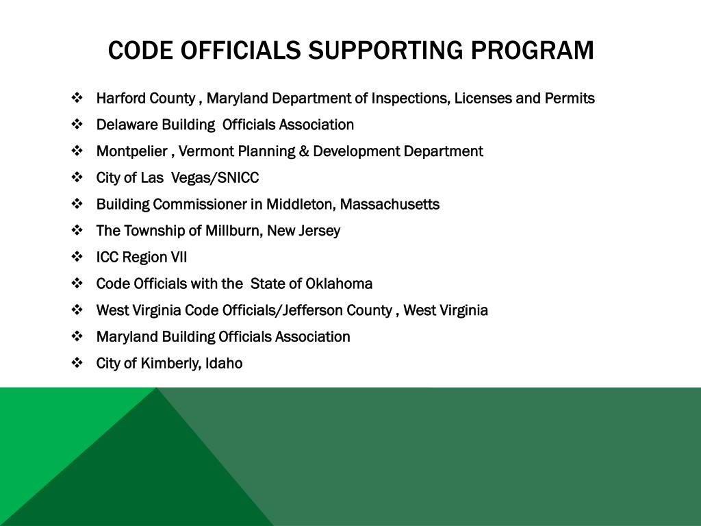 Code officials supporting program • Harford County , Maryland Department of Inspections, Licenses and Permits • Delaware Building Officials Association • Montpelier , Vermont Planning & Development Department • City of Las Vegas/SNICC • Building Commissioner in Middleton, Massachusetts • The Township of Millburn, New Jersey • ICC Region VII • Code Officials with the State of Oklahoma • West Virginia Code Officials/Jefferson County , West Virginia • Maryland Building Officials Association • City of Kimberly, Idaho