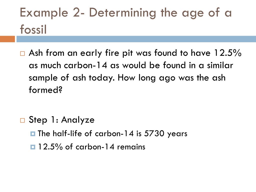 Example 2- Determining the age of a fossil • Ash from an early fire pit was found to have 12.5% as much carbon-14 as would be found in a similar sample of ash today. How long ago was the ash formed? • Step 1: Analyze • The half-life of carbon-14 is 5730 years • 12.5% of carbon-14 remains