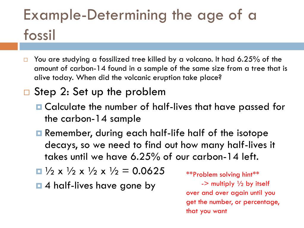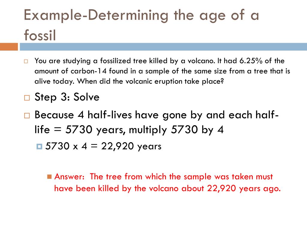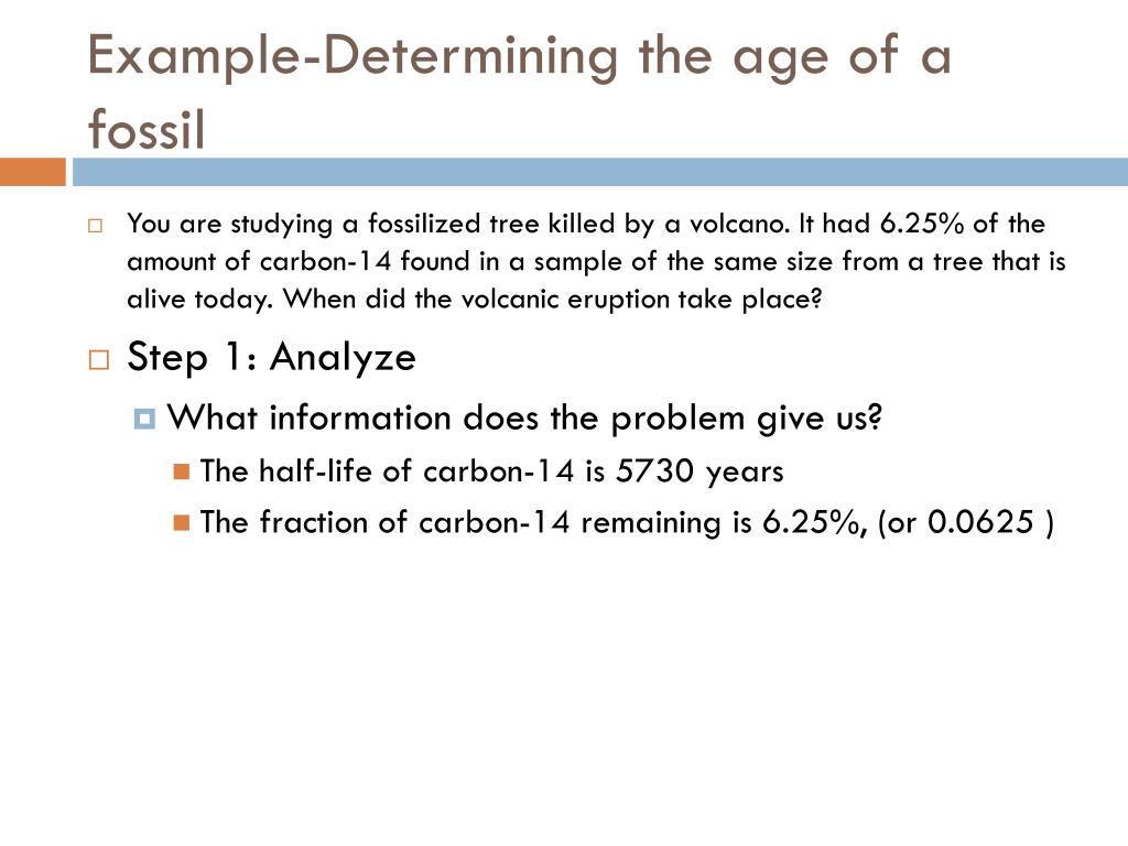 Determining the age of a fossil • Example • You are studying a fossilized tree killed by a volcano. It had 6.25% of the amount of carbon-14 found in a sample of the same size from a tree that is alive today. When did the volcanic eruption take place? • Let’s take a step-wise approach to solving this problem….