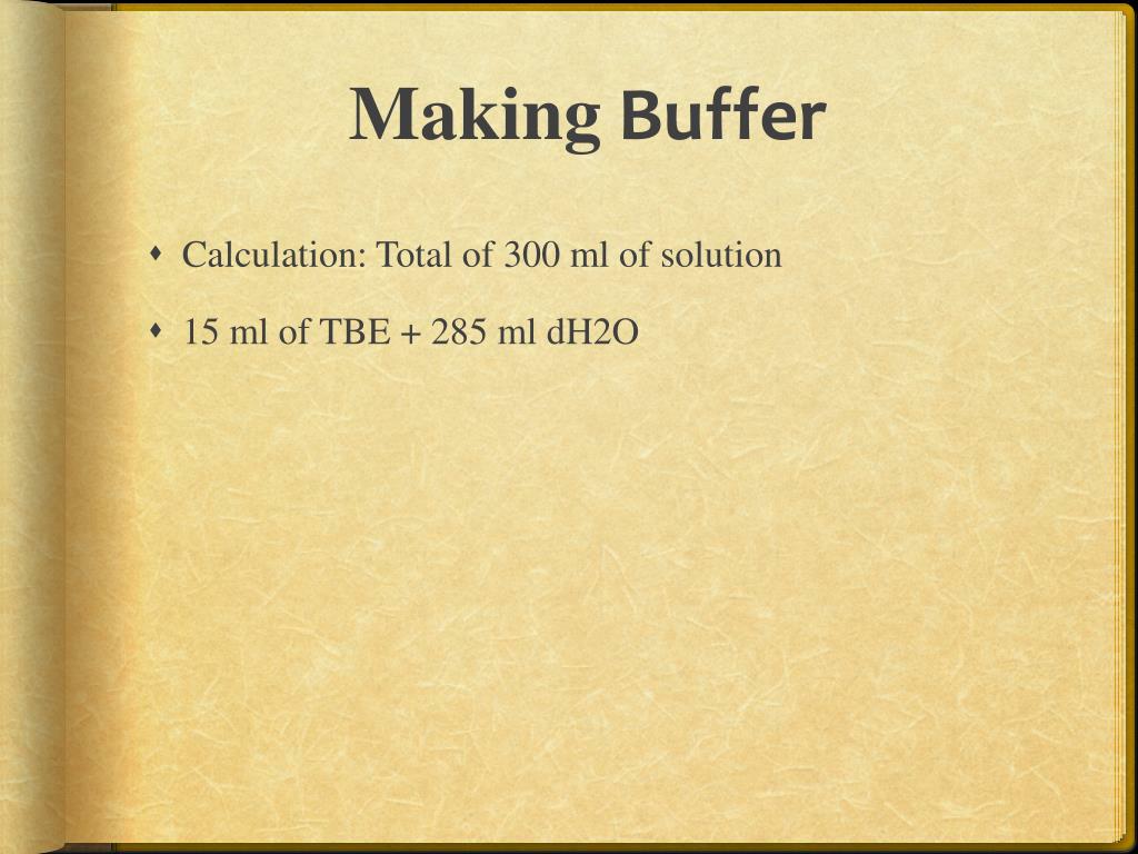 Making Buffer • Calculation: Total of 300 ml of solution • 15 ml of TBE + 285 ml dH2O