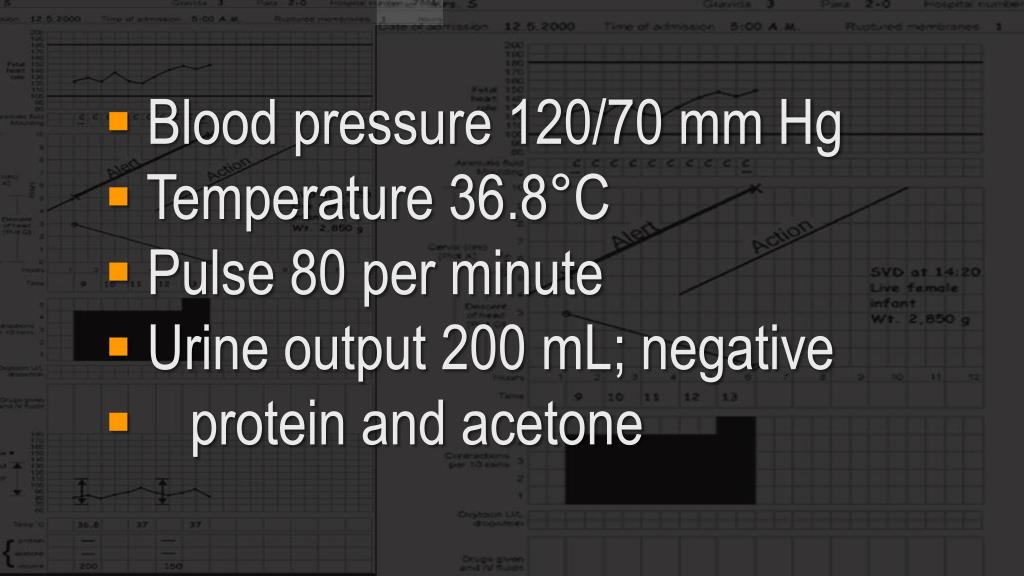 Blood pressure 120/70 mm Hg • Temperature 36.8°C • Pulse 80 per minute • Urine output 200 mL; negative • protein and acetone