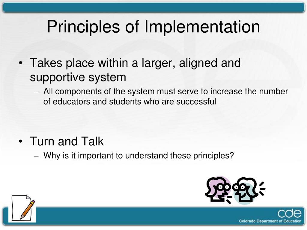 Principles of Implementation Mike • Takes place within a larger, aligned and supportive system • All components of the system must serve to increase the number of educators and students who are successful • Turn and Talk • Why is it important to understand these principles?
