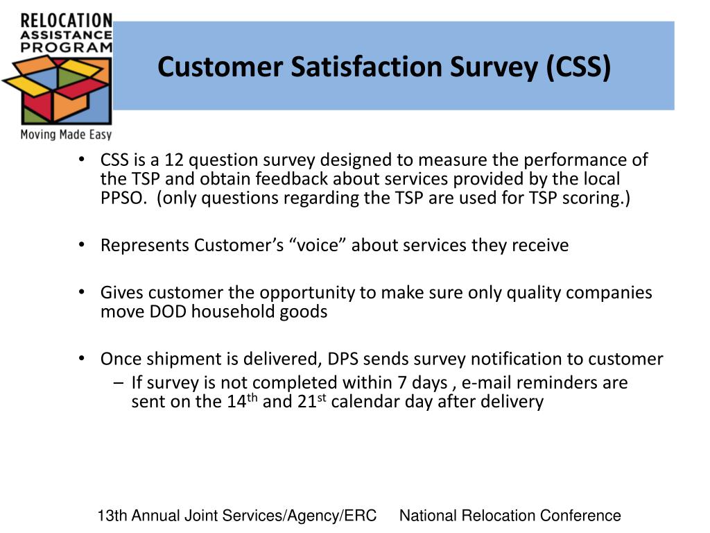Customer Satisfaction Survey (CSS) • CSS is a 12 question survey designed to measure the performance of the TSP and obtain feedback about services provided by the local PPSO. (only questions regarding the TSP are used for TSP scoring.) • Represents Customer’s “voice” about services they receive • Gives customer the opportunity to make sure only quality companies move DOD household goods • Once shipment is delivered, DPS sends survey notification to customer • If survey is not completed within 7 days , e-mail reminders are sent on the 14th and 21st calendar day after delivery 13th Annual Joint Services/Agency/ERC National Relocation Conference
