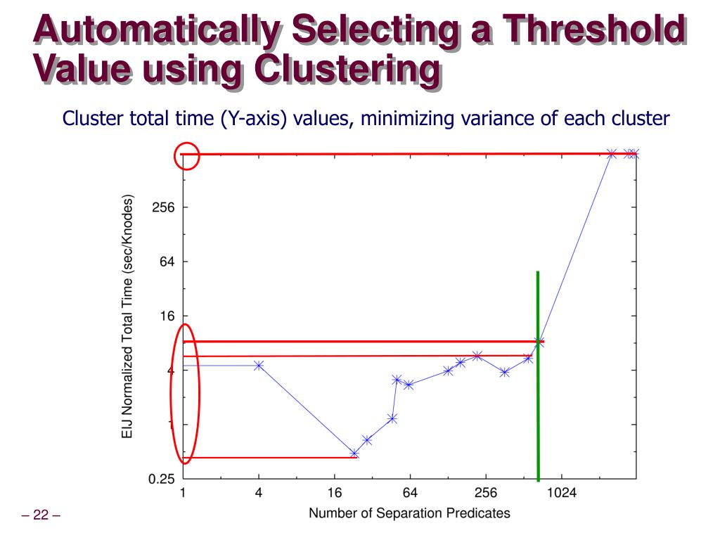 Automatically Selecting a Threshold Value using Clustering Cluster total time (Y-axis) values, minimizing variance of each cluster