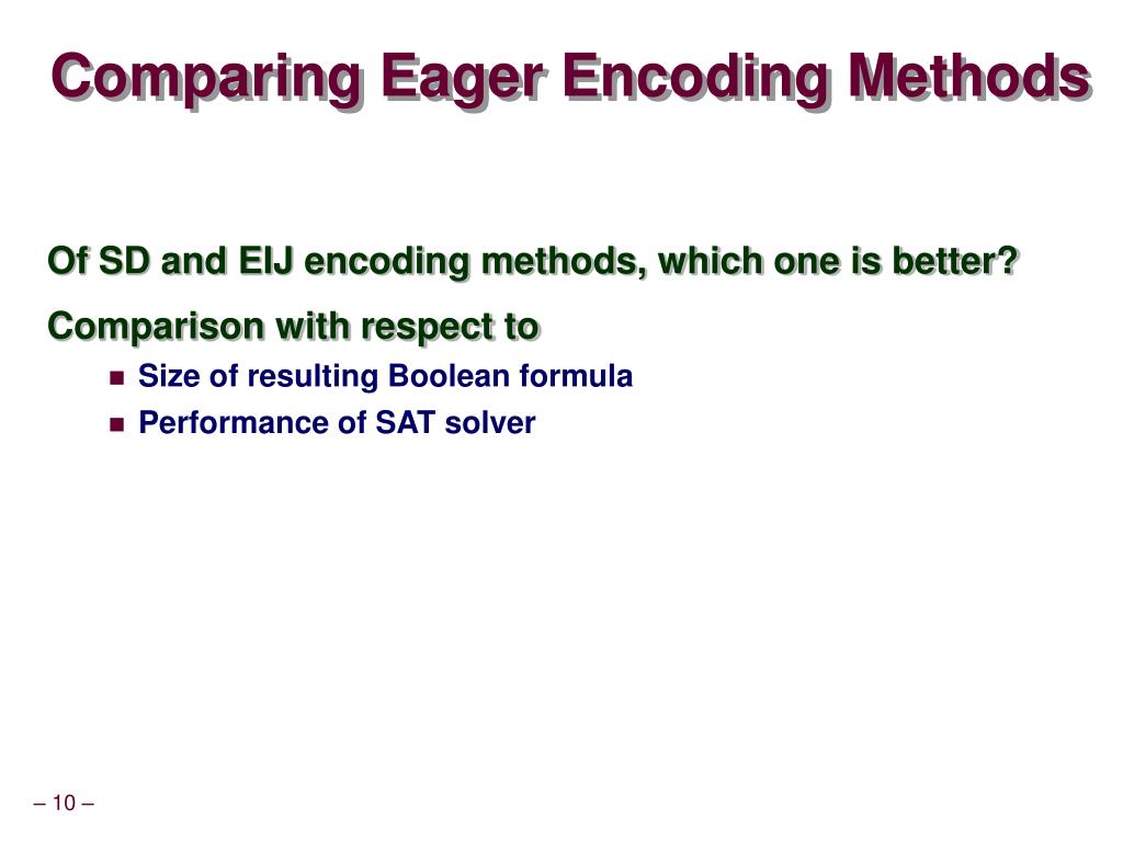 Comparing Eager Encoding Methods • Of SD and EIJ encoding methods, which one is better? • Comparison with respect to • Size of resulting Boolean formula • Performance of SAT solver