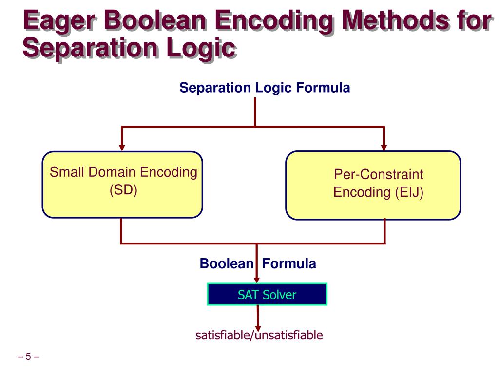Boolean Formula SAT Solver satisfiable/unsatisfiable Eager Boolean Encoding Methods for Separation Logic Separation Logic Formula Small Domain Encoding (SD) Per-Constraint Encoding (EIJ)