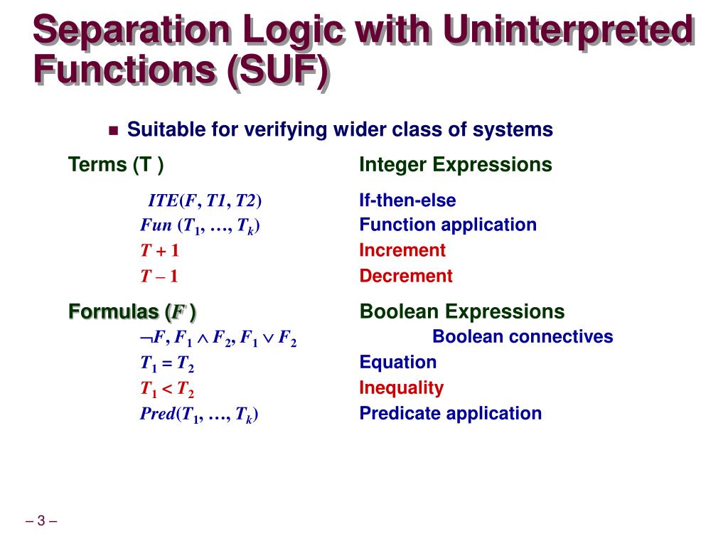 Suitable for verifying wider class of systems Terms (T ) Integer Expressions ITE(F, T1, T2)If-then-else Fun (T1, …, Tk) Function application T + 1 Increment T – 1 Decrement Formulas (F )Boolean Expressions F, F1F2, F1F2 Boolean connectives T1 = T2 Equation T1 < T2 Inequality Pred(T1, …, Tk) Predicate application Separation Logic with Uninterpreted Functions (SUF)