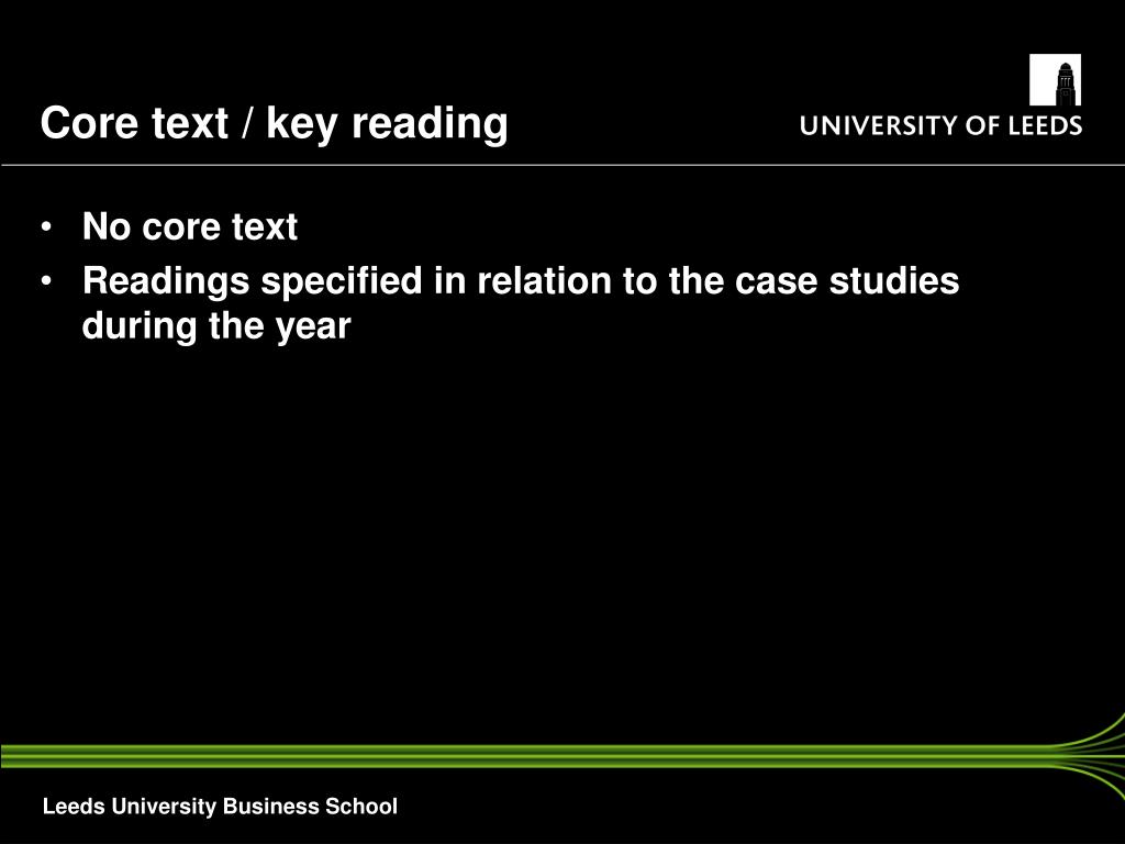 Core text / key reading • No core text • Readings specified in relation to the case studies during the year