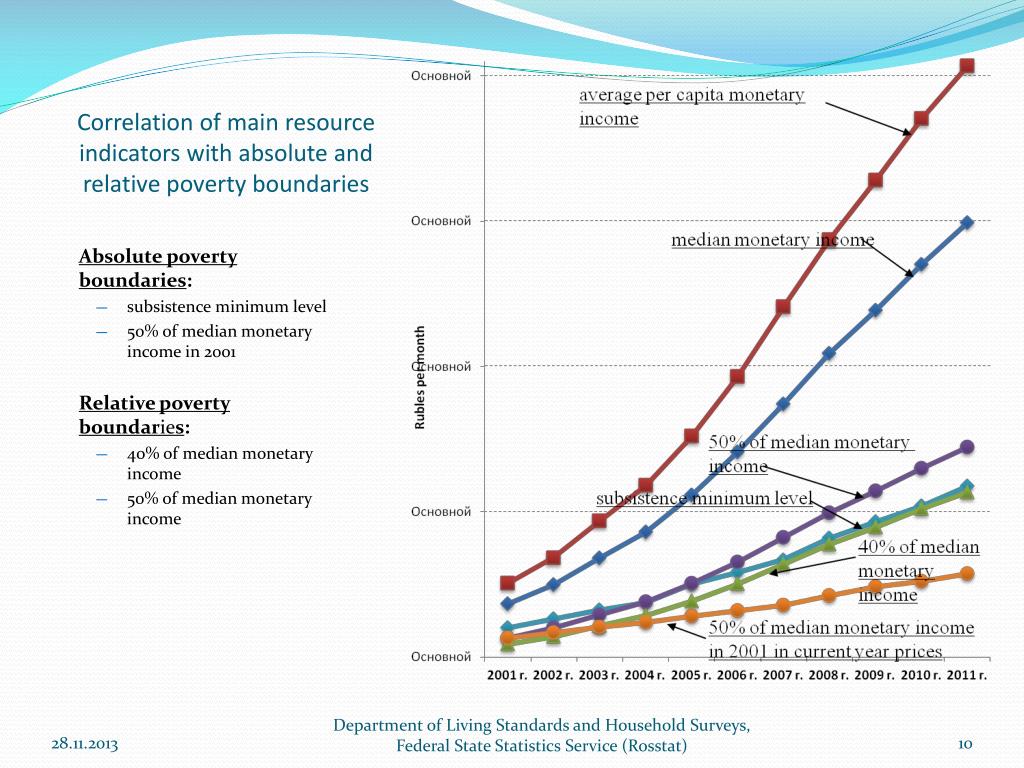 Correlation of mainresource indicators with absolute and relative poverty boundaries Absolute poverty boundaries: subsistence minimum level 50% of median monetary incomein 2001 Relative poverty boundaries: 40% of median monetary income 50% of median monetary income Department of Living Standards and Household Surveys, Federal State Statistics Service (Rosstat)