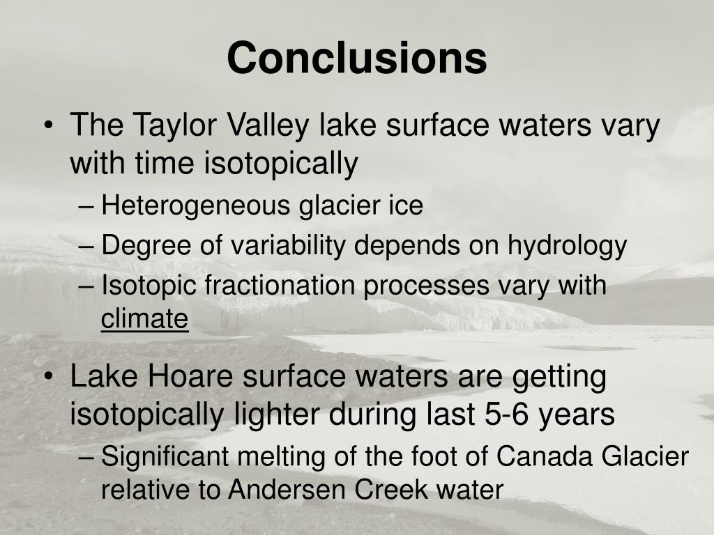 Conclusions • The Taylor Valley lake surface waters vary with time isotopically • Heterogeneous glacier ice • Degree of variability depends on hydrology • Isotopic fractionation processes vary with climate • Lake Hoare surface waters are getting isotopically lighter during last 5-6 years • Significant melting of the foot of Canada Glacier relative to Andersen Creek water