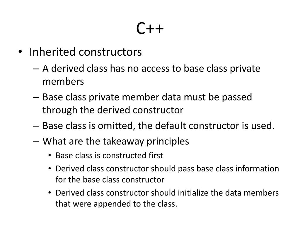 C++ • Inherited constructors • A derived class has no access to base class private members • Base class private member data must be passed through the derived constructor • Base class is omitted, the default constructor is used. • What are the takeaway principles • Base class is constructed first • Derived class constructor should pass base class information for the base class constructor • Derived class constructor should initialize the data members that were appended to the class.