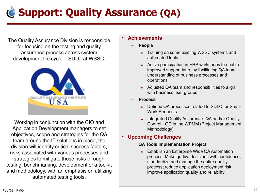 Support: Quality Assurance (QA) • Achievements • People • Training on some existing WSSC systems and automated tools • Active participation in ERP workshops to enable improved support later, by facilitating QA team’s understanding of business processes and operations • Adjusted QA team and responsibilities to align with business user groups • Process • Defined QA processes related to SDLC for Small Work Requests • Integrated Quality Assurance- QA and/or Quality Control - QC in the WPMM (Project Management Methodology) • Upcoming Challenges • QA Tools Implementation Project • Establish an Enterprise Wide QA Automation process: Make go-live decisions with confidence; standardize and manage the entire quality process; reduce application deployment risk; improve application quality and reliability The Quality Assurance Division is responsible for focusing on the testing and quality assurance process across system development life cycle – SDLC at WSSC. Working in conjunction with the CIO and Application Development managers to set objectives, scope and strategies for the QA team around the IT solutions in place, the division will identify critical success factors, risks associated with various processes and strategies to mitigate those risks through testing, benchmarking, development of a toolkit and methodology, with an emphasis on utilizing automated testing tools.