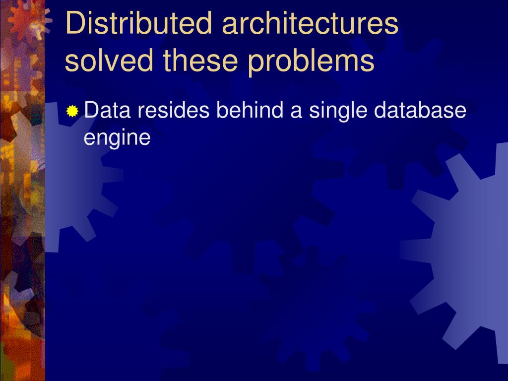 Distributed architectures solved these problems • Data resides behind a single database engine