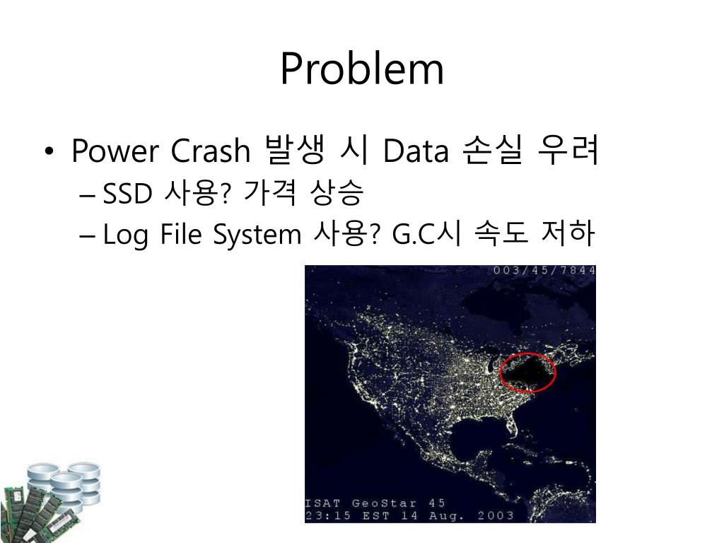 Problem • Power Crash 발생 시 Data 손실 우려 • SSD 사용? 가격 상승 • Log File System 사용? G.C시 속도 저하