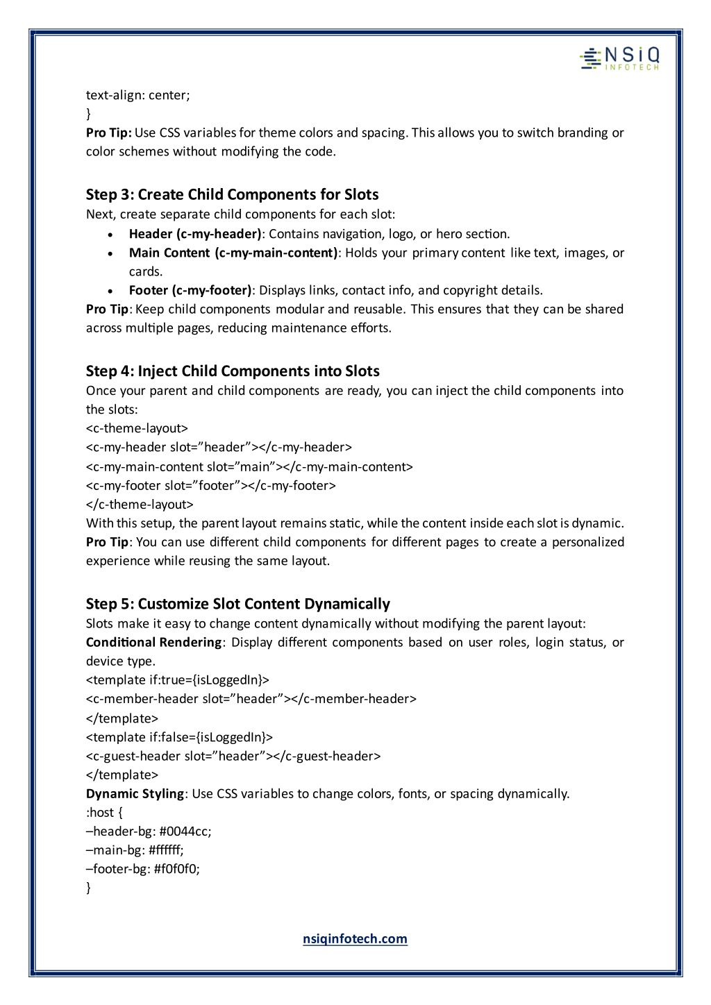 3. text-align: center; } Pro Tip:Use CSS variables for theme colors and spacing. This allows you to switch branding or color schemes without modifying the code. Step 3: Create Child Components for Slots Next, create separate child components for each slot: •Header (c-my-header): Contains navigation, logo, or hero section. •Main Content (c-my-main-content): Holds your primary content like text, images, or cards. •Footer (c-my-footer): Displays links, contact info, and copyright details. Pro Tip: Keep child components modular and reusable. This ensures that they can be shared across multiple pages, reducing maintenance efforts. Step 4: Inject Child Components into Slots Once your parent and child components are ready, you can inject the child components into the slots: <c-theme-layout> <c-my-header slot=”header”></c-my-header> <c-my-main-content slot=”main”></c-my-main-content> <c-my-footer slot=”footer”></c-my-footer> </c-theme-layout> With this setup, the parent layout remains static, while the content inside each slot is dynamic. Pro Tip: You can use different child components for different pages to create a personalized experience while reusing the same layout. Step 5: Customize Slot Content Dynamically Slots make it easy to change content dynamically without modifying the parent layout: Conditional Rendering: Display different components based on user roles, login status, or device type. <template if:true={isLoggedIn}> <c-member-header slot=”header”></c-member-header> </template> <template if:false={isLoggedIn}> <c-guest-header slot=”header”></c-guest-header> </template> Dynamic Styling: Use CSS variables to change colors, fonts, or spacing dynamically. :host { –header-bg: #0044cc; –main-bg: #ffffff; –footer-bg: #f0f0f0; } nsiqinfotech.com