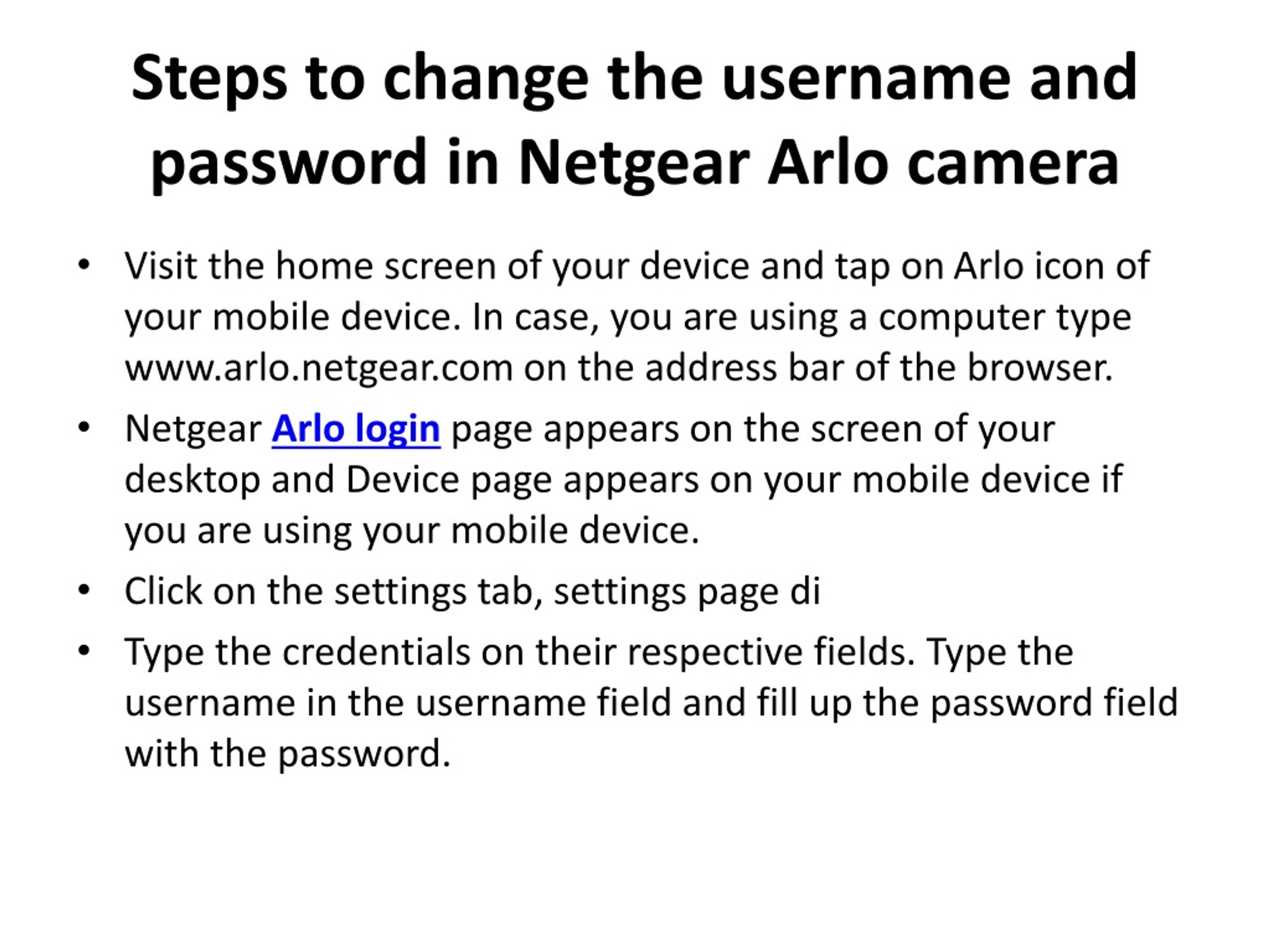 How to change the username and password within the NetgearArlo camera ? Arlo Camera interacts through its web interface, the web menu of which is reached by Arlo login window. The login window of Arlo camera is reached by www.arlo.netgear.com. While performing Arlo Camera Setup for the first time, the user has to type in the default credentials on the login window.