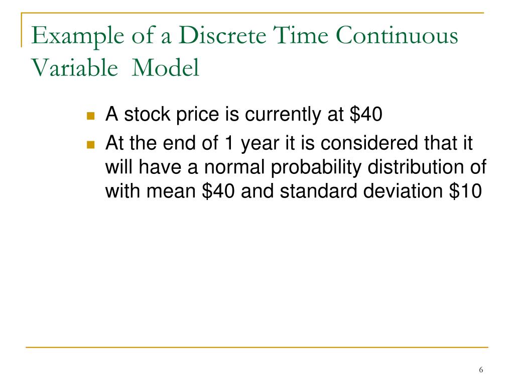 Example of a Discrete Time Continuous Variable Model • A stock price is currently at $40 • At the end of 1 year it is considered that it will have a normal probability distribution of with mean $40 and standard deviation $10
