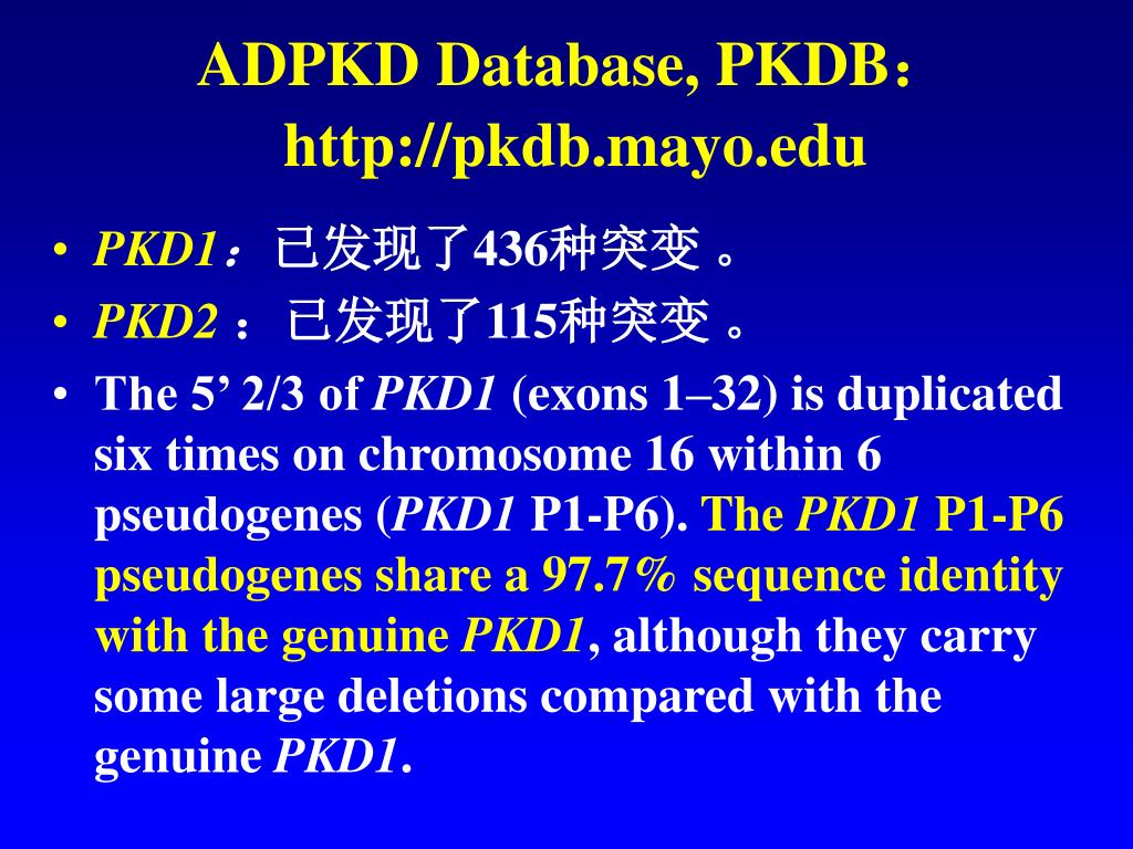 ADPKD Database, PKDB:http://pkdb.mayo.edu PKD1:已发现了436种突变 。 PKD2:已发现了115种突变 。 The 5’ 2/3 of PKD1 (exons 1–32) is duplicated six times on chromosome 16 within 6 pseudogenes (PKD1 P1-P6). The PKD1 P1-P6 pseudogenes share a 97.7% sequence identity with the genuine PKD1, although they carry some large deletions compared with the genuine PKD1.