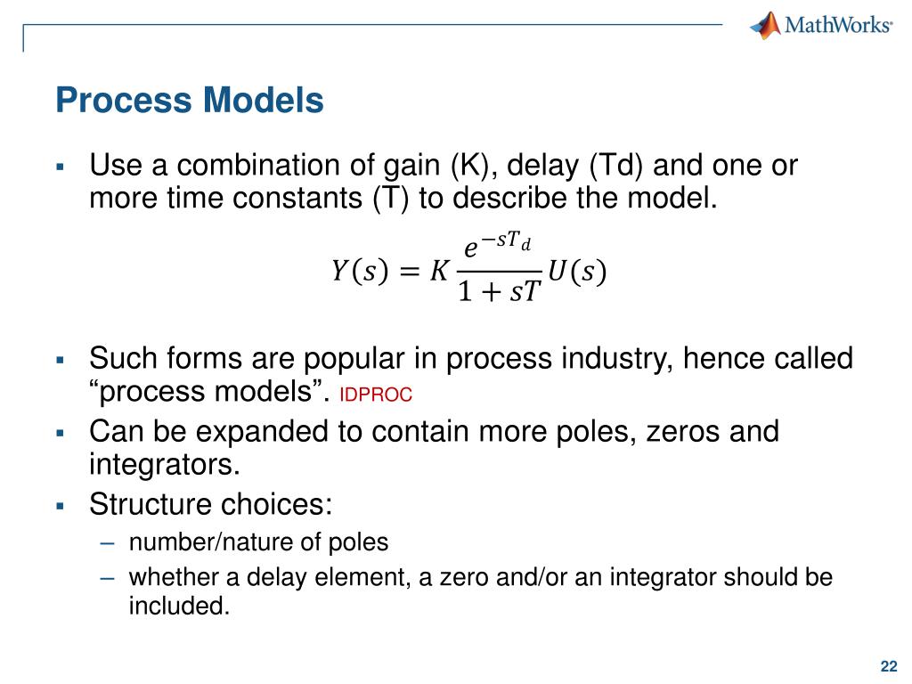 Process Models • Use a combination of gain (K), delay (Td) and one or more time constants (T) to describe the model. • Such forms are popular in process industry, hence called “process models”. IDPROC • Can be expanded to contain more poles, zeros and integrators. • Structure choices: • number/nature of poles • whether a delay element, a zero and/or an integrator should be included.