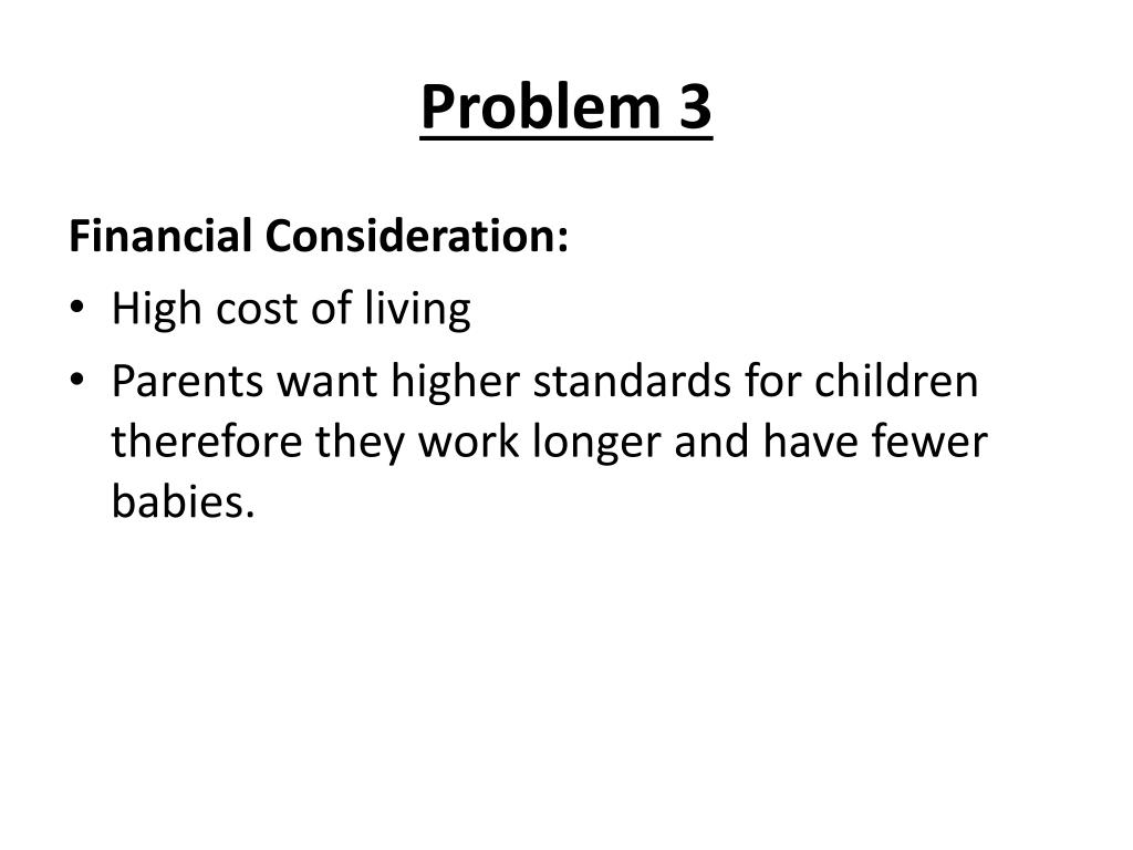 Problem 3 Financial Consideration: • High cost of living • Parents want higher standards for children therefore they work longer and have fewer babies.