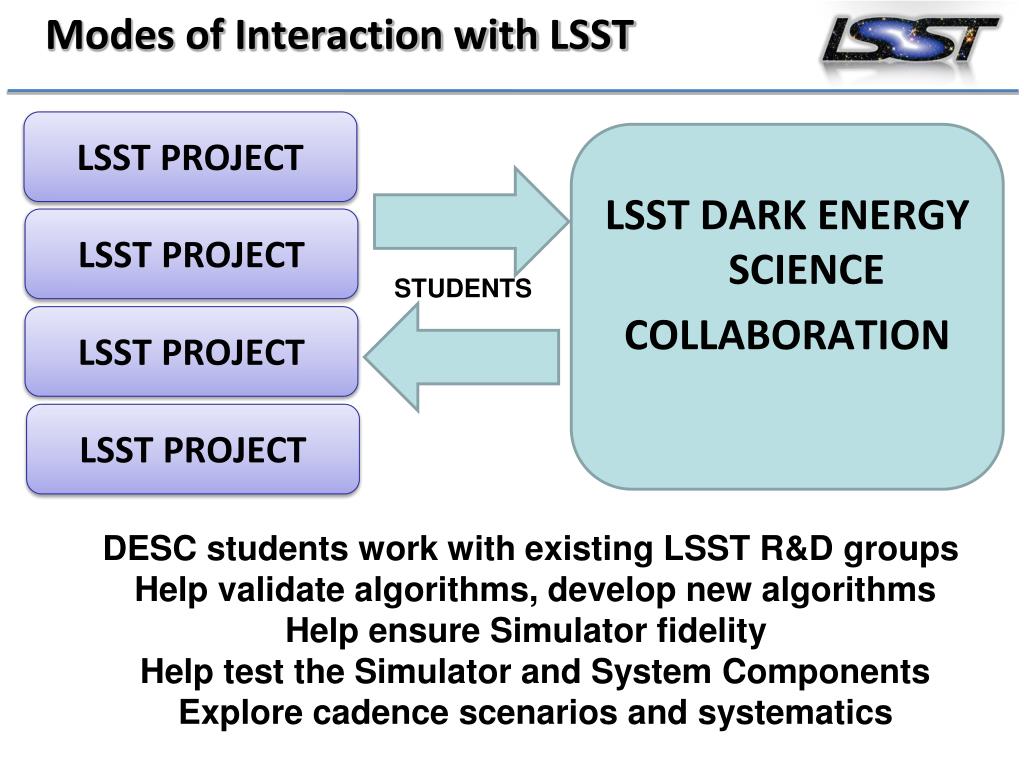 Modes of Interaction with LSST LSST PROJECT LSST DARK ENERGY SCIENCE COLLABORATION LSST PROJECT STUDENTS LSST PROJECT LSST PROJECT DESC students work with existing LSST R&D groups Help validate algorithms, develop new algorithms Help ensure Simulator fidelity Help test the Simulator and System Components Explore cadence scenarios and systematics