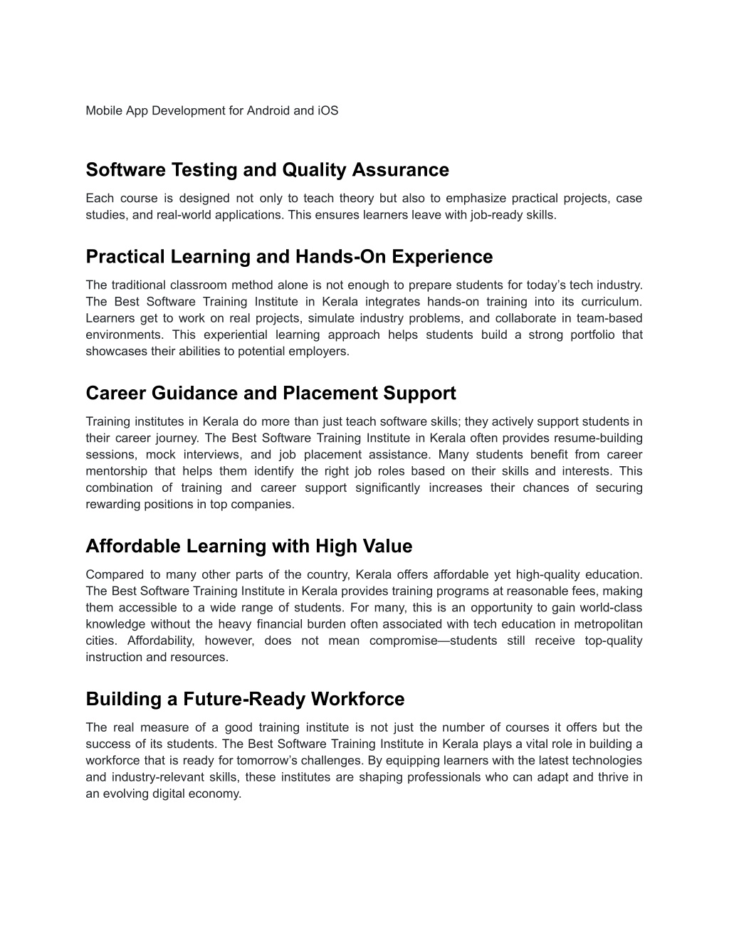 Mobile App Development for Android and iOS Software Testing and Quality Assurance Each course is designed not only to teach theory but also to emphasize practical projects, case studies, and real-world applications. This ensures learners leave with job-ready skills. Practical Learning and Hands-On Experience The traditional classroom method alone is not enough to prepare students for today’s tech industry. The Best Software Training Institute in Kerala integrates hands-on training into its curriculum. Learners get to work on real projects, simulate industry problems, and collaborate in team-based environments. This experiential learning approach helps students build a strong portfolio that showcases their abilities to potential employers. Career Guidance and Placement Support Training institutes in Kerala do more than just teach software skills; they actively support students in their career journey. The Best Software Training Institute in Kerala often provides resume-building sessions, mock interviews, and job placement assistance. Many students benefit from career mentorship that helps them identify the right job roles based on their skills and interests. This combination of training and career support significantly increases their chances of securing rewarding positions in top companies. Affordable Learning with High Value Compared to many other parts of the country, Kerala offers affordable yet high-quality education. The Best Software Training Institute in Kerala provides training programs at reasonable fees, making them accessible to a wide range of students. For many, this is an opportunity to gain world-class knowledge without the heavy financial burden often associated with tech education in metropolitan cities. Affordability, however, does not mean compromise—students still receive top-quality instruction and resources. Building a Future-Ready Workforce The real measure of a good training institute is not just the number of courses it offers but the success of its students. The Best Software Training Institute in Kerala plays a vital role in building a workforce that is ready for tomorrow’s challenges. By equipping learners with the latest technologies and industry-relevant skills, these institutes are shaping professionals who can adapt and thrive in an evolving digital economy.