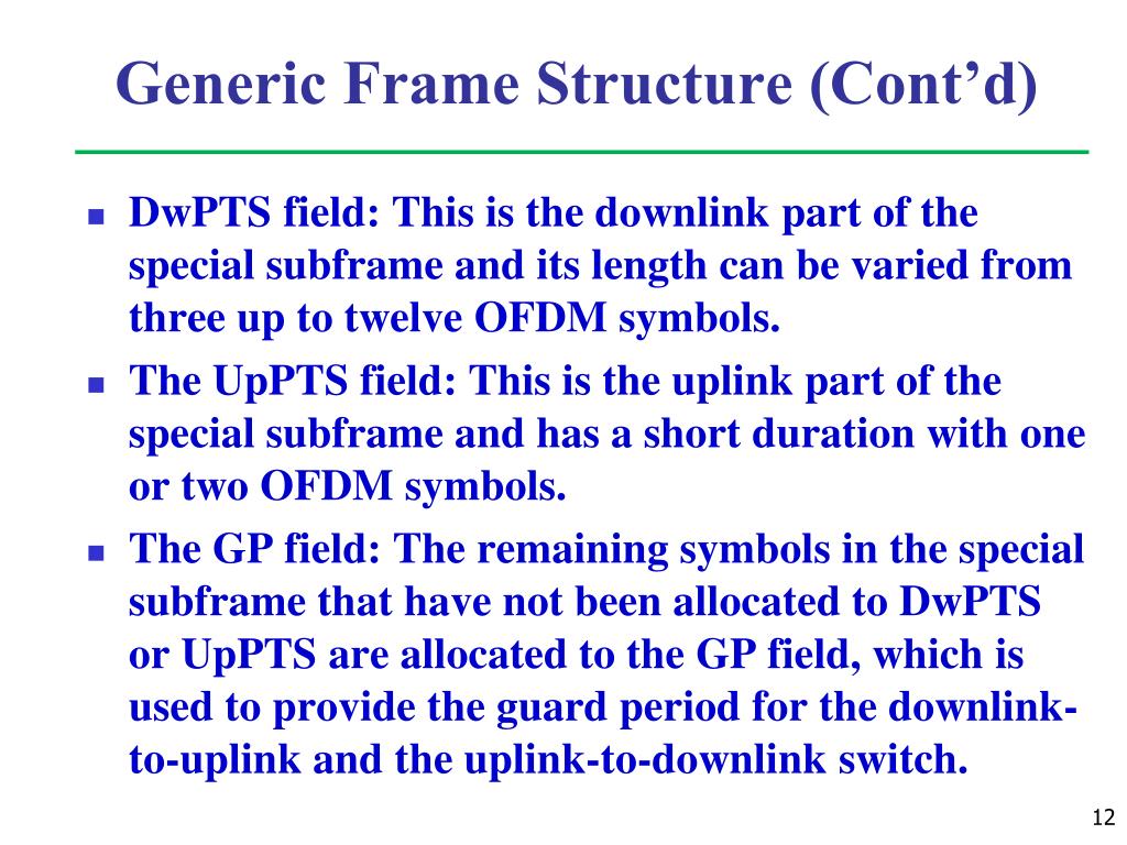 Generic Frame Structure (Cont’d) DwPTS field: This is the downlink part of the special subframe and its length can be varied from three up to twelve OFDM symbols. The UpPTS field: This is the uplink part of the special subframe and has a short duration with one or two OFDM symbols. The GP field: The remaining symbols in the special subframe that have not been allocated to DwPTS or UpPTS are allocated to the GP field, which is used to provide the guard period for the downlink-to-uplink and the uplink-to-downlink switch.