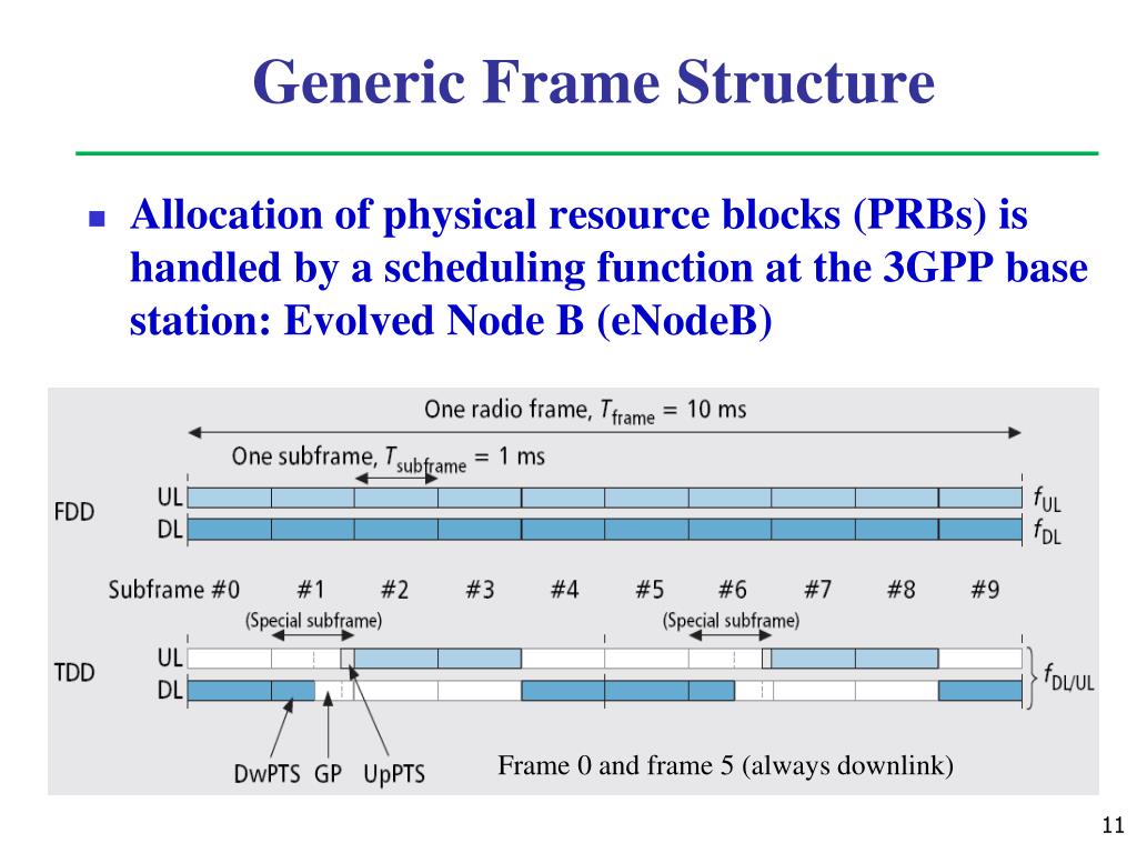 Generic Frame Structure • Allocation of physical resource blocks (PRBs) is handled by a scheduling function at the 3GPP base station: Evolved Node B (eNodeB) Frame 0 and frame 5 (always downlink)