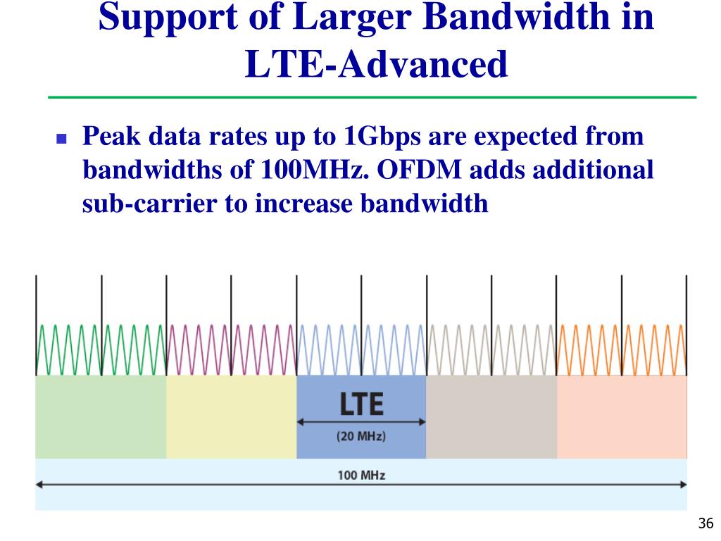 Support of Larger Bandwidth in LTE-Advanced • Peak data rates up to 1Gbps are expected from bandwidths of 100MHz. OFDM adds additional sub-carrier to increase bandwidth
