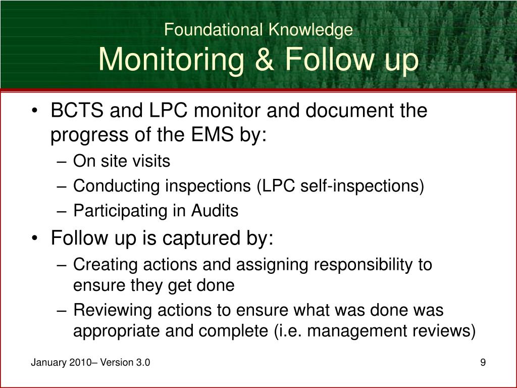 Foundational Knowledge Monitoring & Follow up • BCTS and LPC monitor and document the progress of the EMS by: • On site visits • Conducting inspections (LPC self-inspections) • Participating in Audits • Follow up is captured by: • Creating actions and assigning responsibility to ensure they get done • Reviewing actions to ensure what was done was appropriate and complete (i.e. management reviews)