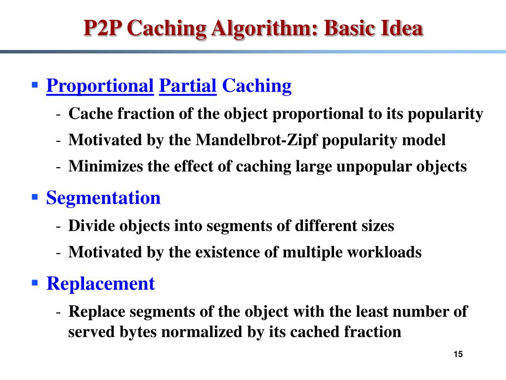 Explore the design of an effective caching scheme for P2P traffic to reduce WAN traffic, costs, and congestion. The solution involves measuring and modeling P2P traffic characteristics and developing a caching algorithm. The study compares P2P caching algorithms and performance through a measurement study using modified Limewire in super peer mode. Object popularity and dynamics, as well as the Mandelbrot-Zipf model for P2P object popularity, are examined to propose a Proportional Partial Caching algorithm for P2P caching. The performance evaluation of various caching policies for web and P2P traffic scenarios is presented, highlighting the importance of partial caching and the algorithm's sensitivity to different factors.
